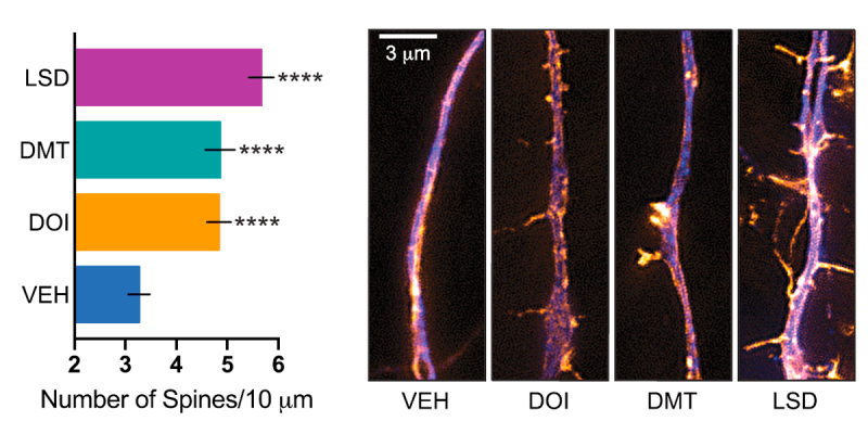 Researchers did a separate measurement of neuroplasticity, and psychedelics were found to dramatically increase the number of dendritic spines on cortical neurons, with LSD near doubling their density (Figure 3).